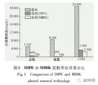 DIPE和MIBK分別作為脫酚萃取劑應用于哈爾濱某煤制氣項目的實際運行效果對比如圖1所示。從圖1可以看出,MIBK對總酚、氨氮和COD的脫除效果均明顯優于DIPE。