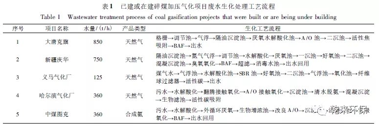 雖然物化預處理工藝可以去除80%以上的有機物,但是廢水中仍含有大量難降解有毒物質,生化處理系統進水中仍含有占總有機碳比例60%以上的酚類化合物,COD濃度仍達到3000~3500mg/L,總酚濃度仍達到500~700mg/L(其中揮發酚和多元酚含量分別約為200mg/L和400mg/L),同時含有大量的長鏈烷烴類、芳香烴類、雜環類化合物、氨氮等有毒有害物質,B/C<0.3,水質可生化性差,具有很強的微生物抑制性,仍是典型的高濃度難生物降解的工業廢水。目前,普遍采用生物組合技術處理碎煤加壓氣化廢水,如表1所示。