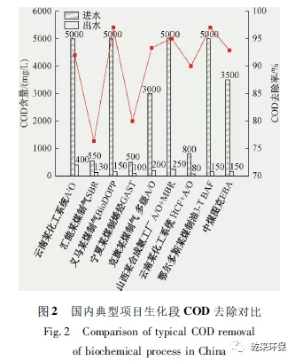 多數項目最終出水COD、氨氮分別低于80mg/L、15mg/L;但仍有部分工藝設置不合理的項目出水COD、氨氮分別高于150mg/L、15mg/L甚至更高。使用“臭氧+BAF”工藝的項目如中煤圖克、慶華某煤制氣項目,可以有效控制出水COD低于60mg/L,氨氮低于2mg/L。