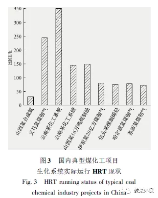 HRT反映的是待處理污水在反應器內的停留時間,從圖3中可以看出,絕大所數項目的生化系統HRT均在100h左右甚至更高,說明高濃煤化工廢水需要較長的停留時間來保證其處理效果的穩定。極少數項目,如山西公司合成氨的HRT較低(僅14h),則是因其煤質好,廢水水質清潔(COD為600~800mg/L,氨氮為50~100mg/L,總酚為40~60mg/L)。總體來講,煤化工廢水,特別是碎煤加壓氣化項目廢水生化處理的HRT值設置普遍較高。