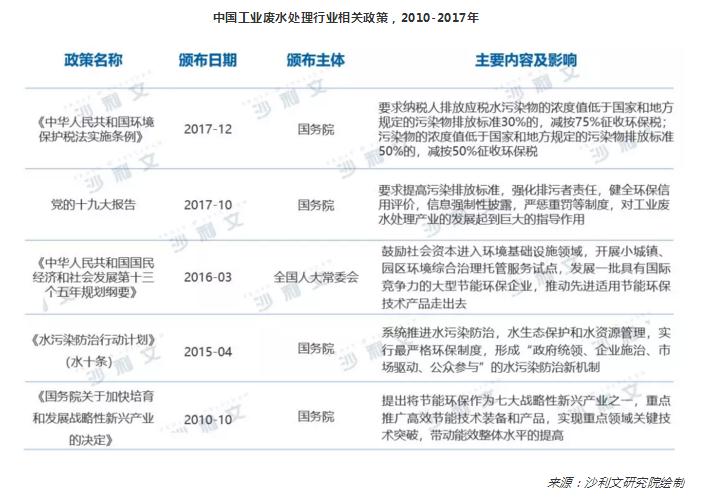 工業廢水處理作為環境治理的重要環節之一,在工業生產中發揮了重要的作用。2010年10月,中國國務院在《關于加快培育和發展戰略性新興產業的決定》中提出將節能環保作為七大戰略性新興產業之一,重點推廣高效節能技術裝備和產品,實現重點領域關鍵技術突破,帶動能效整體水平的提高。2015年4月,中國國務院頒發了《水污染防治行動計劃》(“水十條”),是中國首次對工業水處理進行監管的標志,從多個角度對工業廢水處理提出考核要求,如提出要治理有色金屬、印染、焦化、原料藥制造等十大重點行業專項治理方案,實施清潔化改造,實現整治水污染的目標。此外,“水十條”也提出治理工業集聚區污染等238項強有力的措施??梢?,中國在注重減少污染物排放總量的同時,更加注重水環境質量的改善和環境風險的防控。2017年10月,在中國黨的十九大報告中,要求提高污染排放標準,強化排污者責任,健全環保信用評價、信息強制性披露、嚴懲重罰等制度,這對工業廢水處理行業的發展將起到巨大的指導作用。
