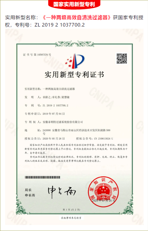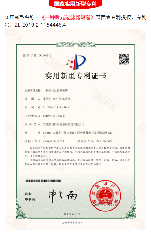 安徽菲利特始終重視科技創新和技術研發,不斷加大研發投入,提高創新研發能力,并與生產實踐相結合,加快實現新技術的成果轉化,而這些專利成果的獲得,勢必增強安徽菲利特技術工作人員的信心,為創造高質量過濾設備發揮更好的作用,著力于為客戶提供更多過濾系統解決方案。