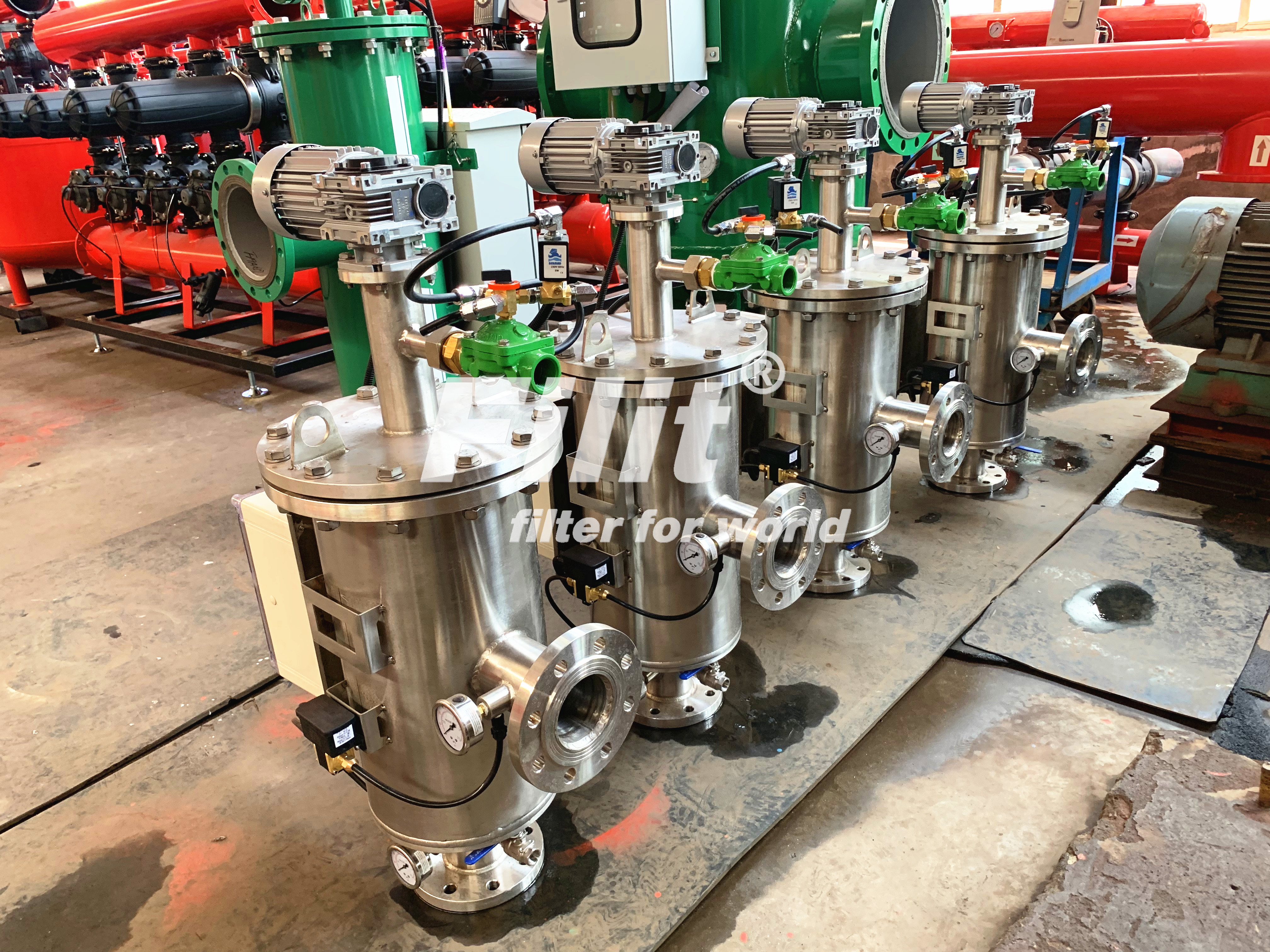 作業時,液體有入口流經濾網,通過出口進入用戶所須的管道進行工藝循環,水中的顆粒雜技被截留在濾網內部。液體循環留下來的顆粒越來越多,過濾速度越來越慢,而進口的污水仍源源不斷地進入,濾孔會越來越小,由此在進、出口之間產生壓力差,當大度差達到設定值時,差壓變送器將信號傳送到控制器,控制器啟動驅動馬達通過傳動組件帶動軸轉動,同時排污口打開,由排污口排出,當濾網清洗完畢后,壓差降到最小值,過濾器回到初始過濾工作狀態,系統正常運行。