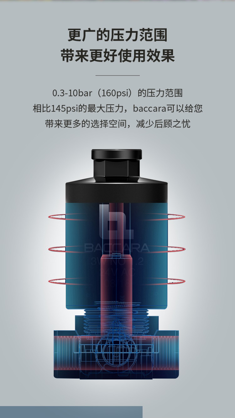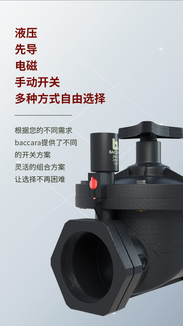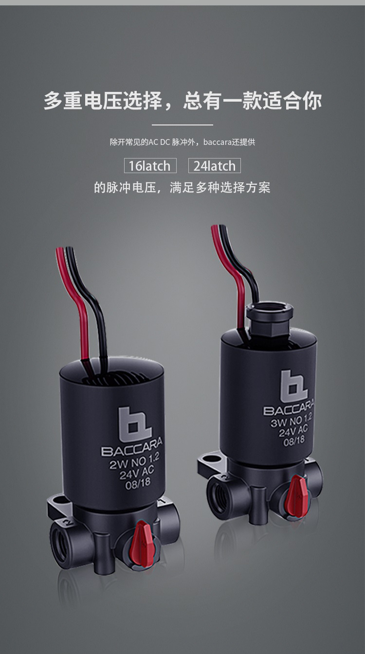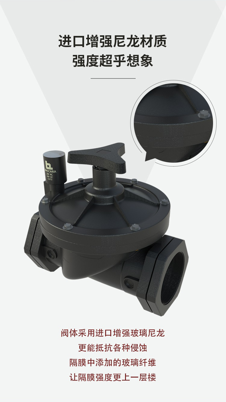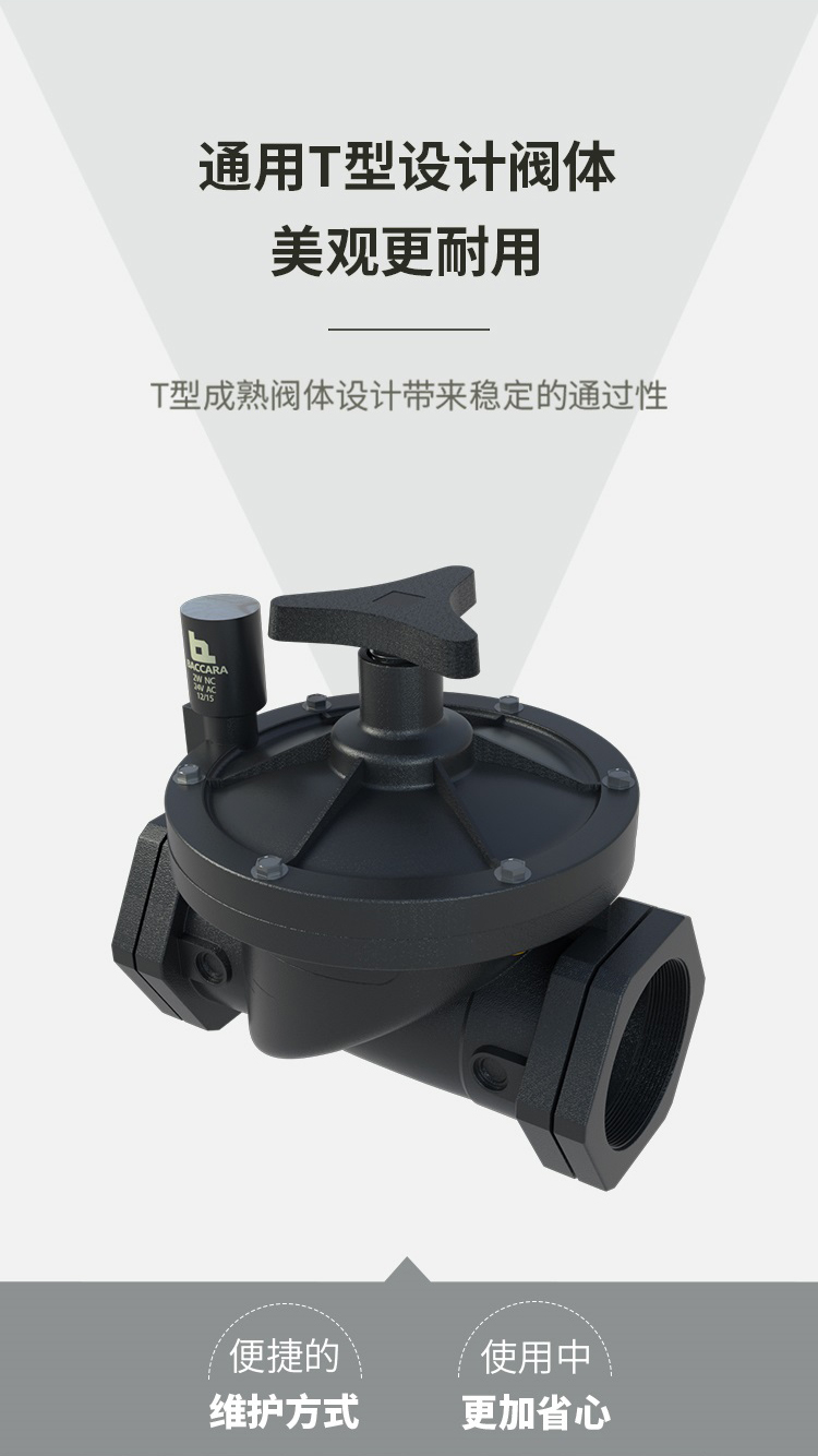 功能 2 通常閉閥 接口尺寸 3/4", 1", 1-1/2", 2" 英標 & 美標 壓力范圍 0.3 to 10bar 溫度范圍 流體溫度 : 5oC to 50oC (非冰凍條件) 環境 溫度: -10oC to 50oC 原材料 手動旋鈕: 增強尼龍 主閥: 增強尼龍 電磁閥柱: 不銹鋼 AISI 300 & 400 系列 隔膜: 3/4" - 1" : EPDM | 1-1/2" - 2" : NR 密封圈: Buna - N 彈簧: 不銹鋼 AISI 300 系列 電磁頭 ? G75,2通常閉電磁閥, 所有電壓均適用. ? 直流交流以及脈沖電流 線圈電壓 ? 電壓及功耗 - 見下方圖表 ?所有baccara線圈功耗都是常規電壓的 ± 10%