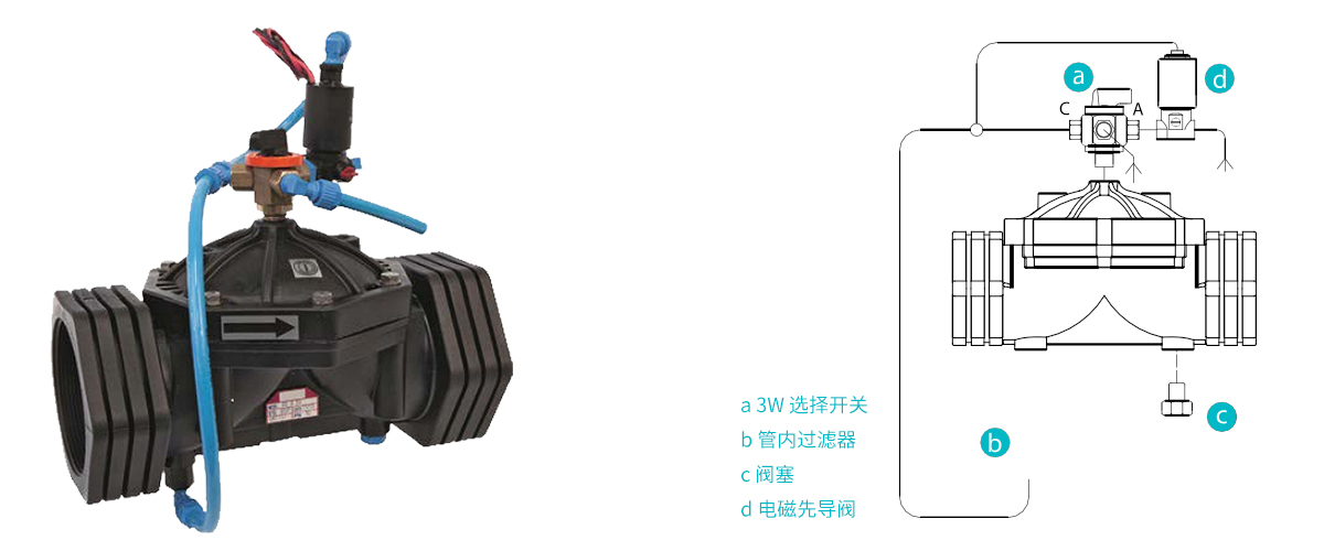 ■ G500-ELM : 3 通常開電磁閥,聚乙烯塑料管道系統,增強尼龍閥體以及三通手動選擇開關閥