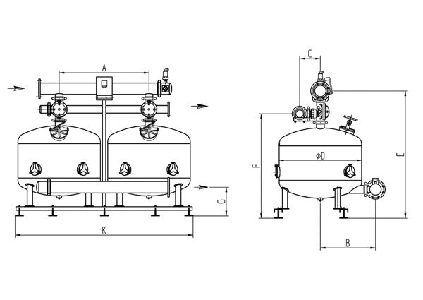 型號 罐子數(shù)量標(biāo)準(zhǔn)流量范圍 過濾面積(m3) 反沖洗流量 介質(zhì)用量(kg) 最大壓力(Mpa)進(jìn)出水管尺寸排污管尺寸重量(kg)最小流量(m3/h) 最大流量(m3/h) 海砂 1-2mm FSL16-2 2 12 20 0.26 10 220 1 3” 2” 140 FSL24-2 2 30 50 0.58 20 500 1 3” 3” 216 FSL30-2 2 30 70 0.91 35 640 1 4” 3” 318 FSL36-2 2 60 100 1.31 45 920 0.8 4” 3” 400 FSL40-2 2 90 130 1.62 65 1120 0.7 6” 4” 512 FSL48-2 2 100 180 2.32 80 1600 0.6 6” 4” 650 FSL48-3 3 150 270 3.48 80 2400 0.6 6” 4” 975 FSL48-4 4 200 360 4.65 80 3200 0.6 8” 4” 1300 FSL48-5 5 250 450 5.81 80 4000 0.6 8” 4” 1760 FSL48-6 6 300 540 6.97 80 4800 0.6 8” 4” 1950 FSL60-2 2 160 220 3.64 130 2500 0.6 6” 4” 972