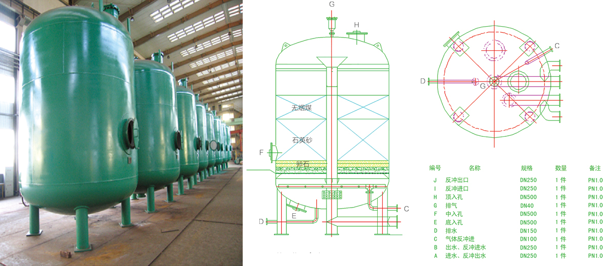 型號 濾水面積(㎡)最高速率(m3/h)最大濾水量(m3/h)最大進(jìn)水壓力濾前水水質(zhì) 濾水后水質(zhì) 過濾器內(nèi)平均壓力損失過濾器清洗參數(shù) 懸浮物 油 懸浮物 油 反洗水強(qiáng)度 反洗水壓力 反洗空氣強(qiáng)度 反洗空氣壓力 GSL-2 3.14 40 125 0.4MPa ≤80mg/L ≤10-20mg/L ≤10mg/L ≤5-10mg/L ~0.05Mpa 40m3/㎡h ~0.05Mpa 15m3/㎡h 0..07MPa GSL-2.6 5.31 40 210 0.4MPa ≤80mg/L ≤10-20mg/L ≤10mg/L ≤5-10mg/L ~0.05Mpa 40m3/㎡h ~0.05Mpa 15m3/㎡h 0..07MPa GSL-3 7.07 40 280 0.4MPa ≤80mg/L ≤10-20mg/L ≤10mg/L ≤5-10mg/L ~0.05Mpa 40m3/㎡h ~0.05Mpa 15m3/㎡h 0..07MPa GSL-3.5 9.62 40 385 0.4MPa ≤80mg/L ≤10-20mg/L ≤10mg/L ≤5-10mg/L ~0.05Mpa 40m3/㎡h ~0.05Mpa 15m3/㎡h 0..07MPa GSL-4 12.56 40 500 0.4MPa ≤80mg/L ≤10-20mg/L ≤10mg/L ≤5-10mg/L ~0.05Mpa 40m3/㎡h ~0.05Mpa 15m3/㎡h 0..07MPa GSL-4.5 15.9 40 635 0.4MPa ≤80mg/L ≤10-20mg/L ≤10mg/L ≤5-10mg/L ~0.05Mpa 40m3/㎡h ~0.05Mpa 15m3/㎡h 0..07MPa GSL-5 19.63 40 785 0.4MPa ≤80mg/L ≤10-20mg/L ≤10mg/L ≤5-10mg/L ~0.05Mpa 40m3/㎡h ~0.05Mpa 15m3/㎡h 0..07MPa
