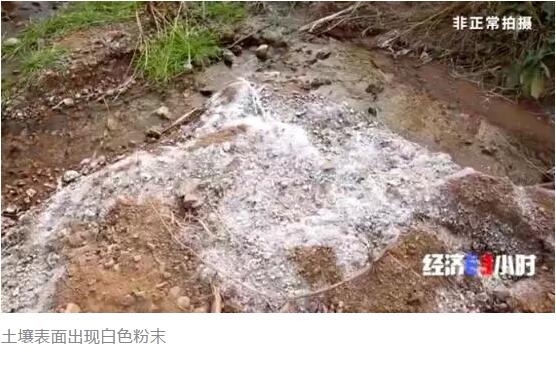 除了冶煉廠尾礦庫排放到河道里的污水,尾礦庫里的廢渣也一直是一個讓當地人心懸的定時炸彈。一位村民把記者帶到工廠新建的一個尾礦庫,已經有生產廢渣堆放在這里,而且廢渣中流出的液體干涸以后也出現了白色粉末,與之前暗渠周圍的白色粉末極其相似。